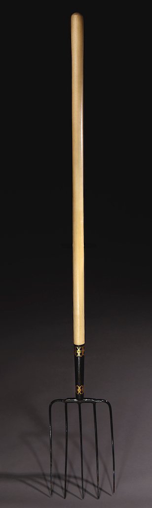 Pitchfork, 2009-2010. H 59” x W 8.5” x D 5.5” (150 cm x 21.5 cm x 14 cm). 24K gold Damascene inlay on found object (carbon steel and ash). Collection of the artist.