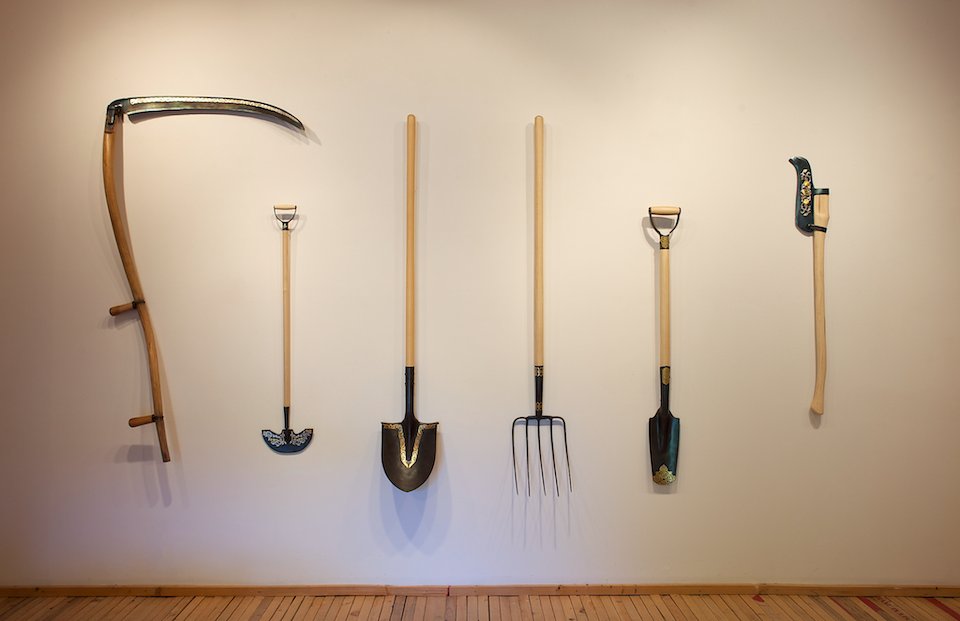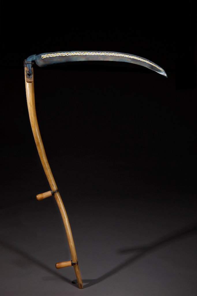 Scythe, 2010. H 58” x W 32” x D 5.5” (147 cm x 81 cm x 14 cm). 24K gold and fine silver Damascene inlay on found object (carbon steel and ash). Collection of the artist.