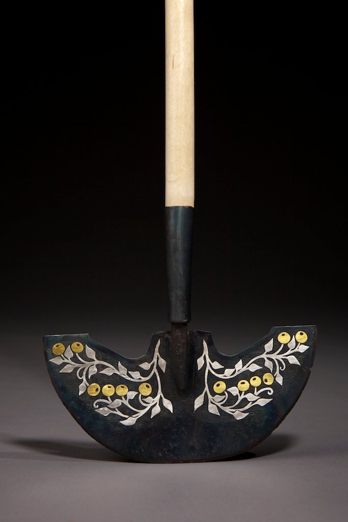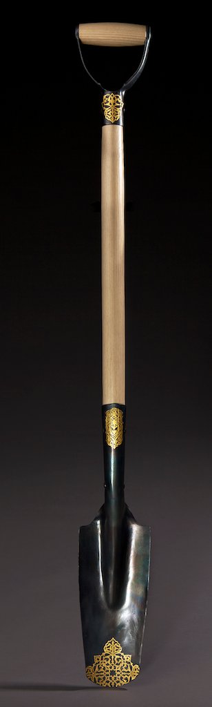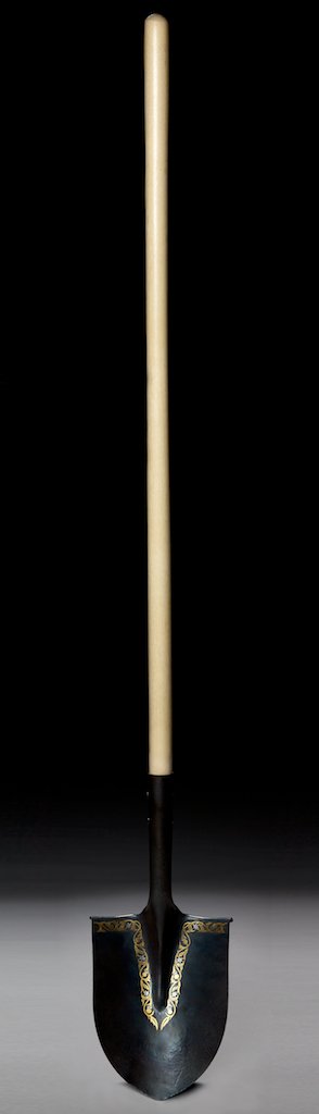 Shovel, 2009. H 58” x W 9” x D 6” (147 cm x 23 cm x 15 cm). 24K gold and fine silver Damascene inlay on found object (carbon steel and ash). Private collection.
