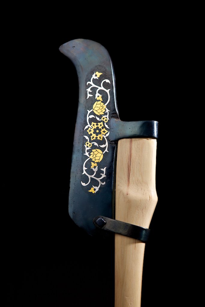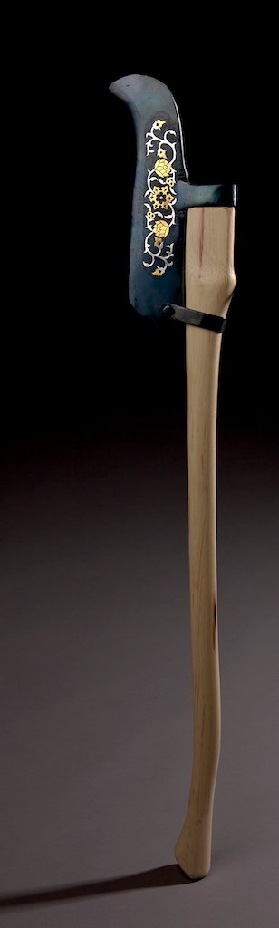 Bill hook, 2010 (detail). H 41.5” x W 7” x D 2.75” (105 cm x 17.8 cm x 7 cm) 24K gold and fine silver Damascene inlay on found object (carbon steel and ash). Collection of the artist.