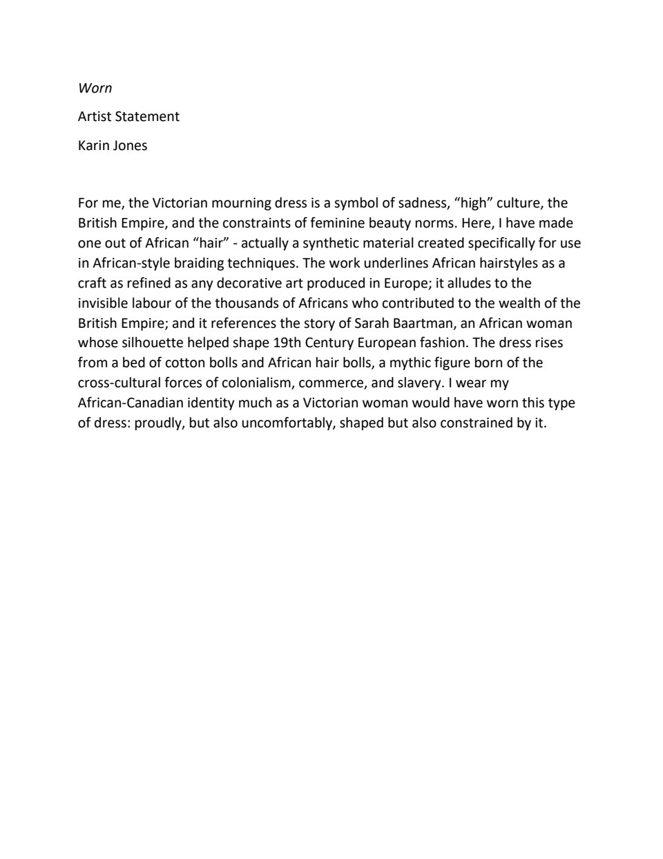 “Worn” is an installation commissioned by the Royal Ontario Museum in 2014/15. Consisting of a Victorian mourning dress made of braided hair extensions, and surrounded by cotton bolls, some of which have been stuffed with my own hair, the work was created to address the presence/absence of Africans in Canada’s historical narrative. It is now part of the museum’s permanent collection. For an expanded artist statement, please see the bottom of this page.