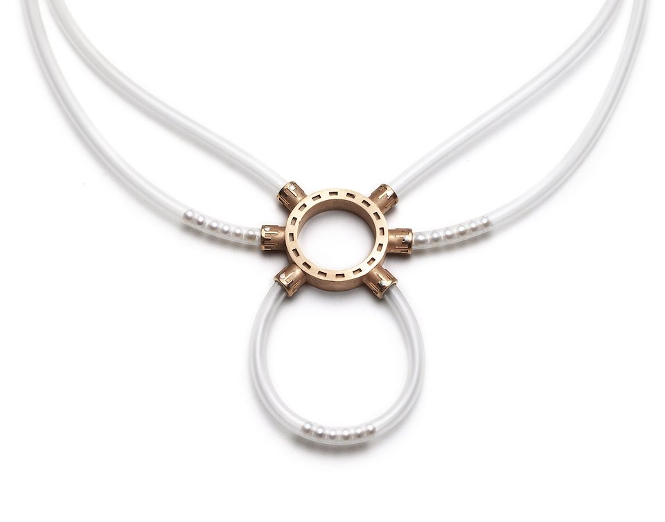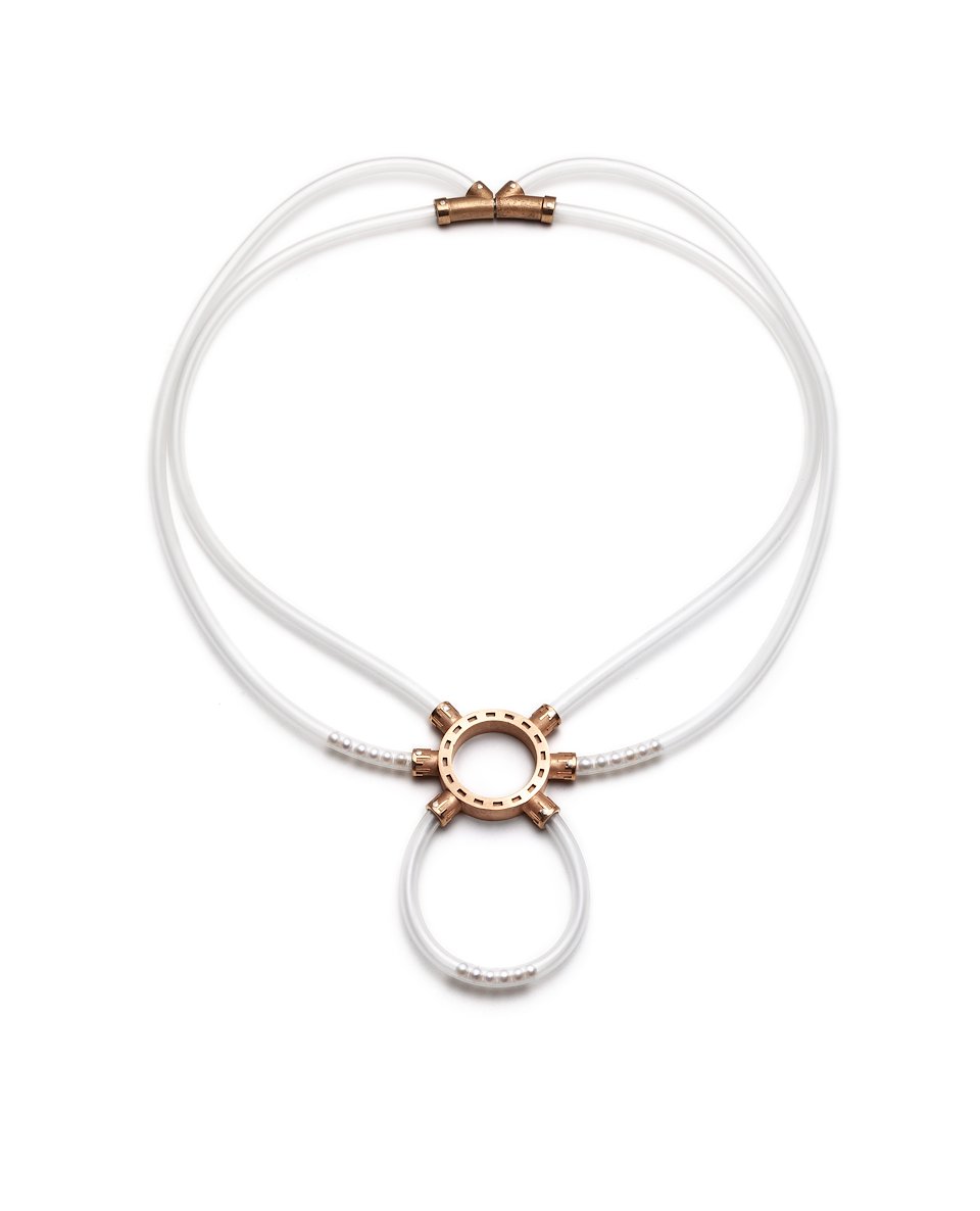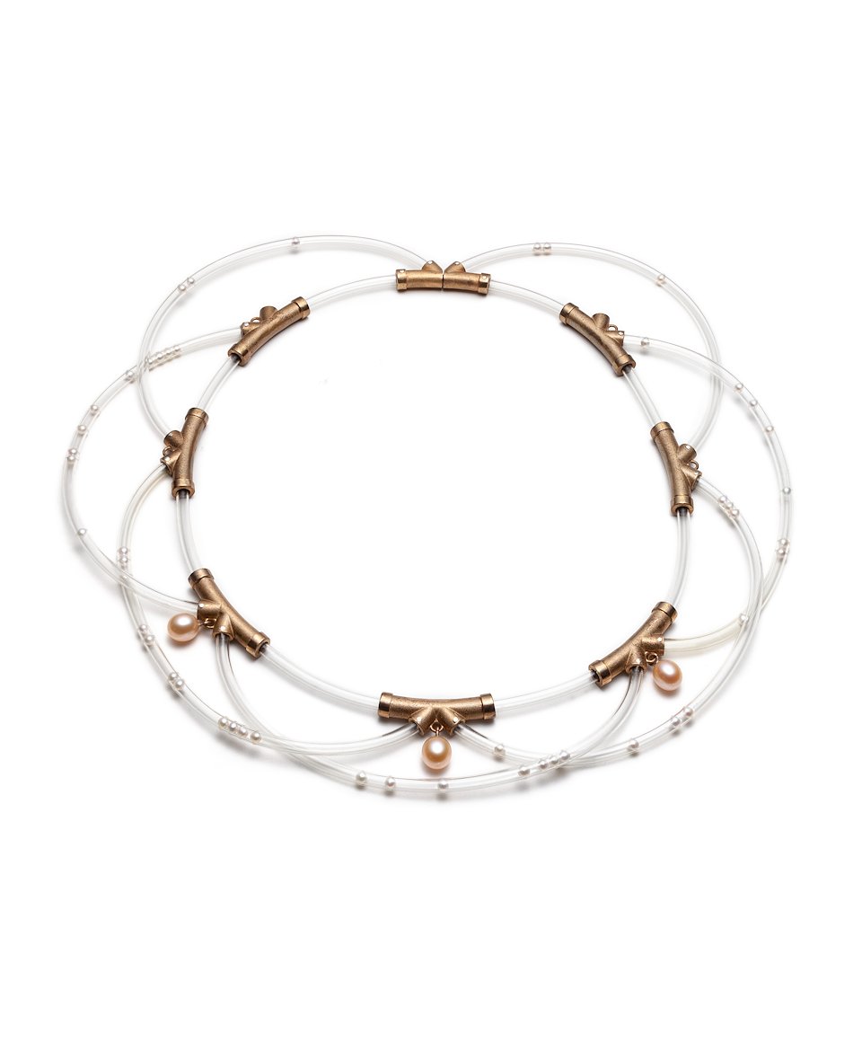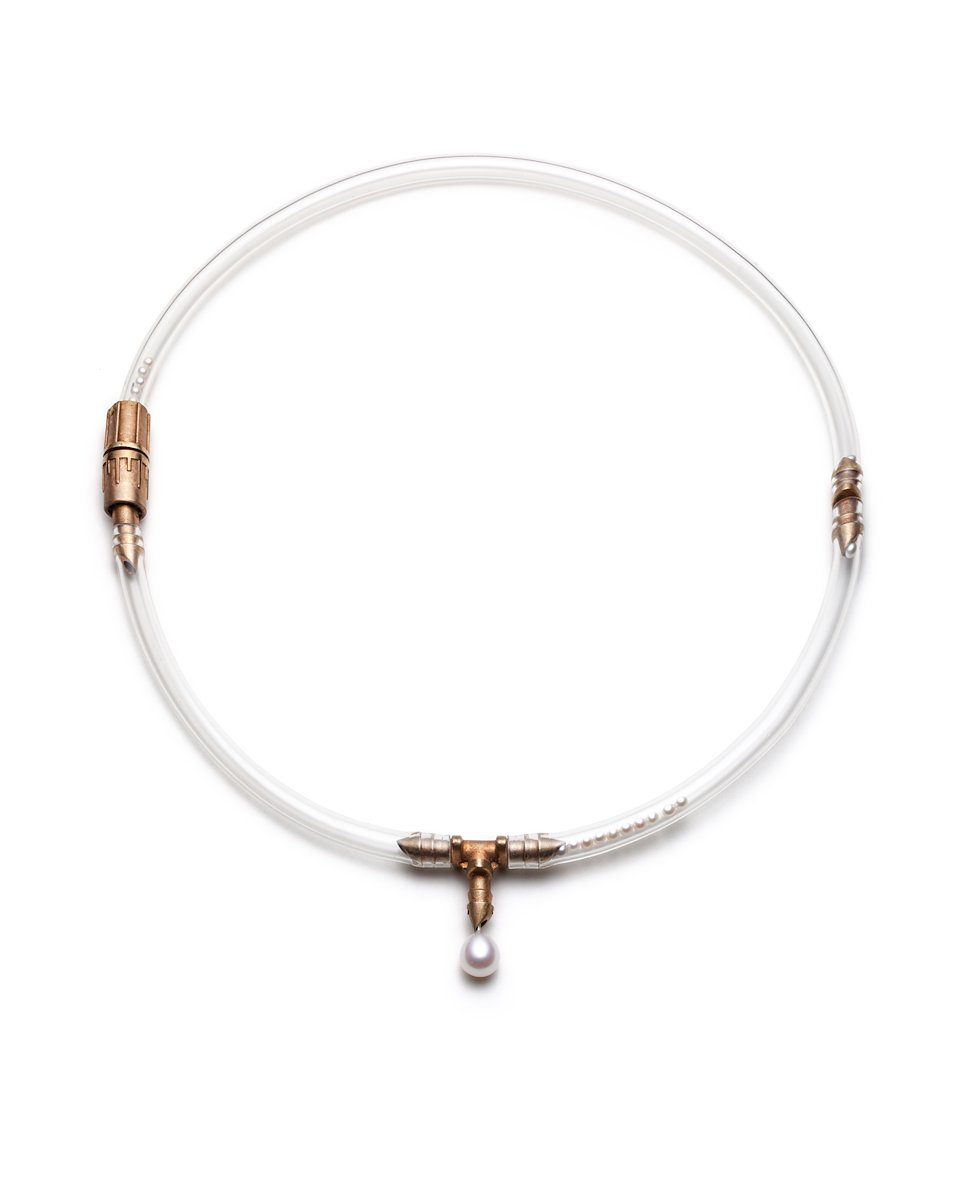Untitled Neckpiece #1, 2015. Bronze, IV tube, pearls. Collection of the artist.