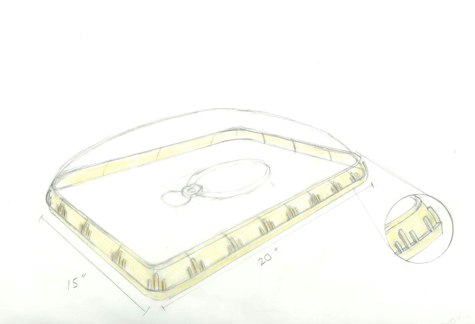 Sketch of a proposed display case in bronze and plexiglas.