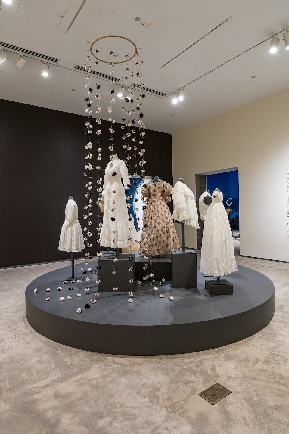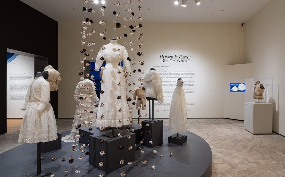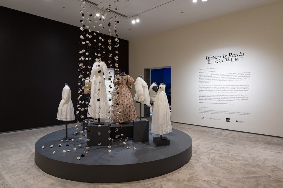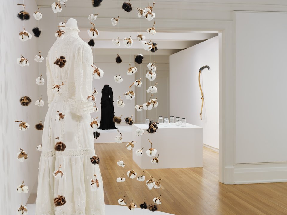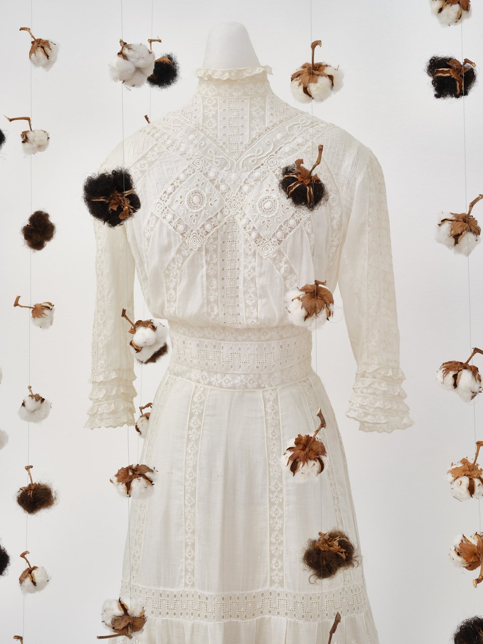 Freed is an installation/intervention I created for the exhibition “History is Rarely Black or White”, at the Agnes Etherington Centre in 2021. The show, curated by Jason Cyrus, positioned the museum’s collection of historic cotton garments in the context of the history of slavery in the southern United States. I created a curtain of hanging cotton bolls, some of which had been stuffed with human hair, to encircle one of the cotton dresses. The intention was that viewers would be unable to view the dress without also confronting the dark history that produced it. It is now part of the museum’s permanent collection, and has subsequently been shown at the Burnaby Art Gallery as part of my solo exhibition there in 2022, using a similar dress from the Burnaby Village Museum’s collection.